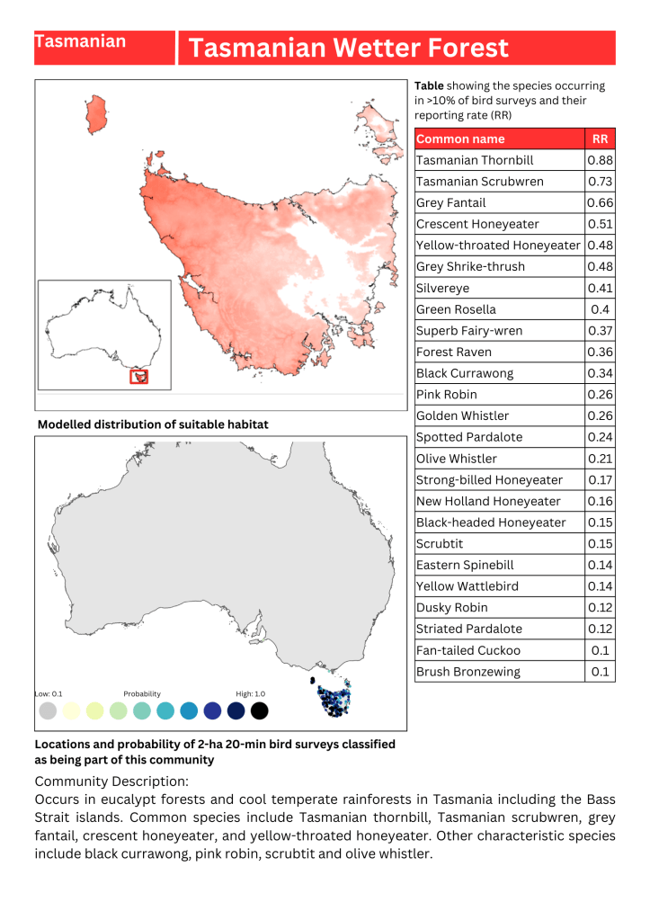 Tasmanian Wetter Forests <- Return to BirdHealth Index Page Continue to survey -> Share this: Click to email a link to a friend (Opens in new window) Email Click to share on X (Opens in new window) X Click to share on LinkedIn (Opens in new window) LinkedIn Click to share on Facebook (Opens in new window) Facebook Click to print (Opens in new window) Print